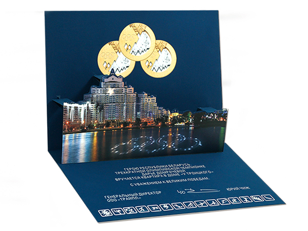 В преддверии возращения победителей домой, в наше агентство поступил сверхважный и срочный заказ. Необходимо было разработать дизайн и осуществить печать сертификатов, открыток для оформления подарков призерам Олимпиады.